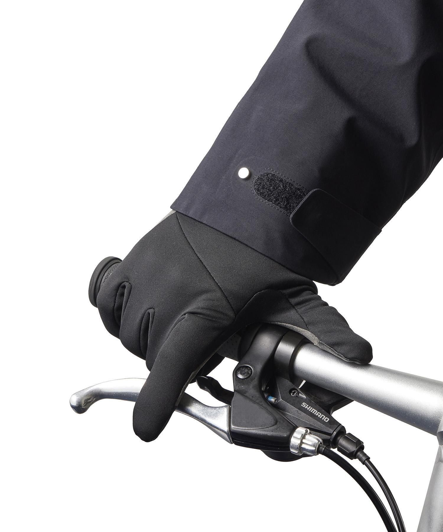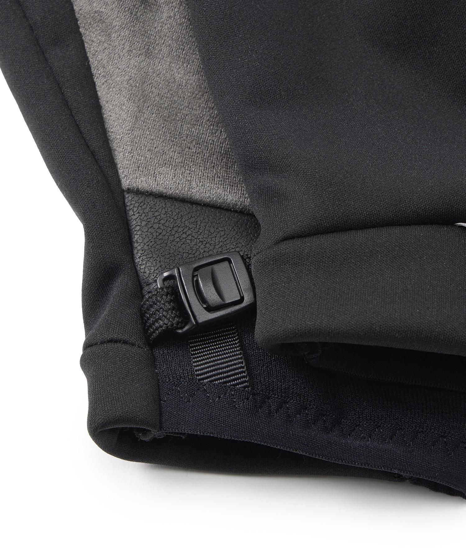 手の可動域を妨げない独自設計パターン。防水・防風・透湿性とストレッチ性に富んだ甲側の素材。グリップ性と耐久性に優れた掌側の素材。